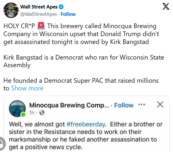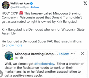 Há apenas dois dias, a conta da cervejaria Minocqua Brewing Company, em Wisconsin, publicou uma mensagem dizendo que “gostariam que fosse o dia da cerveja grátis”, sugerindo que desejavam a morte do presidente Trump. Será possível que Kirk Bangstad, da Minocqua Brewing Company, tivesse informações privilegiadas sobre a tentativa de assassinato? Talvez valha a pena uma investigação do FBI ou do Serviço Secreto, já que ele parecia obcecado com o assassinato do presidente Trump.
