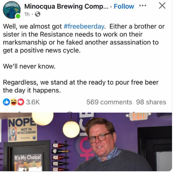 A Minocqua Brewing Company – uma empresa de extrema esquerda em Minocqua, Wisconsin – supostamente usou o Facebook (sua publicação já foi apagada) para expressar sua indignação com o fato de a última tentativa de assassinato do presidente Trump não ter sido bem-sucedida. Eles chegaram a ressuscitar sua repugnante promoção de “cerveja grátis o dia todo no dia da sua morte”, com publicações que, segundo relatos, lamentavam “quase tivemos #diasdecervejagrátis” e zombavam da “ponta de ferro” de quem tentou eliminar o presidente dos Estados.