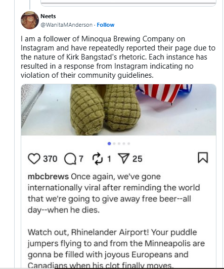 Uma mulher, cujo nome no X é Juanita M Anderson, compartilhou uma imagem da conta do Instagram da cervejaria mostrando um boneco com a aparência de um agente do ICE (Serviço de Imigração e Alfândega dos EUA) com uma bandeira americana dobrada atrás, indicando que ele foi morto. Em sua publicação no X, ela compartilhou a imagem com uma mensagem observando como denunciou repetidamente a conta e o Instagram se recusa a remover as incitações à violência contra o presidente Trump e o ICE: “Sou seguidora da Minoqua Brewing Company no Instagram e denunciei repetidamente a página devido à natureza da retórica de Kirk Bangstad. Em todas as ocasiões, recebi uma resposta do Instagram indicando que não houve violação das diretrizes da comunidade.”