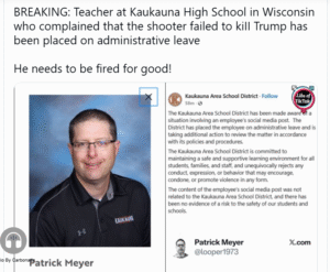 Um professor de estudos sociais da Kaukauna High School foi flagrado lamentando abertamente que o mais recente assassino desequilibrado não tenha conseguido eliminar o presidente Donald Trump.