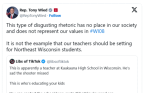 “Esse tipo de retórica repugnante não tem lugar em nossa sociedade e não representa nossos valores em #WI08. Não é o exemplo que nossos professores devem dar aos alunos do nordeste de Wisconsin.”